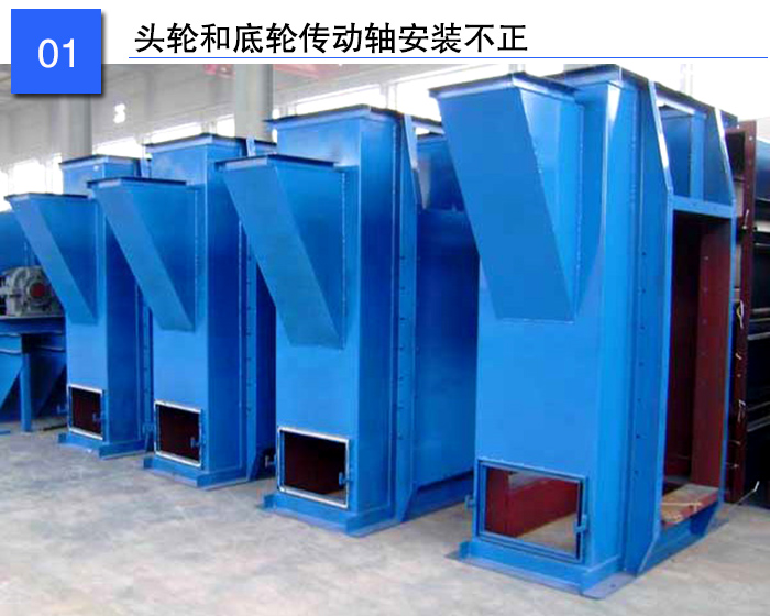 主要体现在以下几个方面:一是头轮和底轮的传动轴在同一垂直平面内且不平行;二是两传动轴都安装在水平位置且不在同一垂直平面内;三是两传动轴平行,在同一垂直平面内且不水平。这时,料斗带跑偏,易引起料斗与机筒的撞击、料斗带的撕裂。