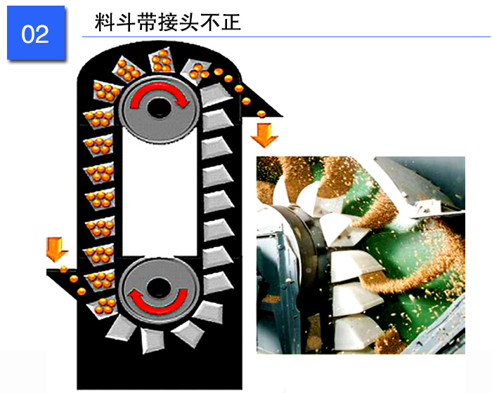 料斗带接头不正是指料斗带结合后,料斗带边缘线不在同一直线上。工作时,料斗带一边紧一边松,使料斗带向紧边侧向移动,产生跑偏,造成料斗盛料不充分,卸料不,回料增多,生产率下降,严重时造成料斗带卡边、撕裂。