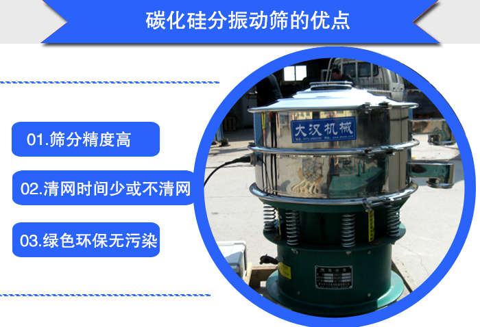 碳化硅粉是粉末状的物料,在筛分时会出现静电、粘附、团聚导致卡堵网的现象,所以大汉机械的技术人员推荐使用超声波振动筛。